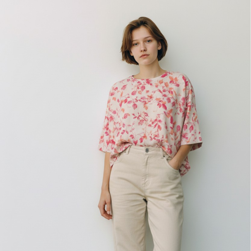 ecru met roze-oranje print / M