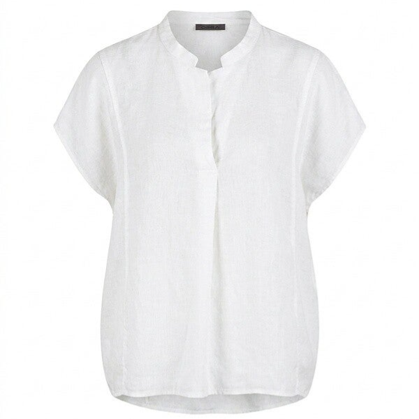 Deze top van puur, ademend linnen is perfect voor warme dagen. Het blousje heeft een klein opstaand kraagje afgewerkt met een polo-achtige knoopsluiting met plooi. De relaxte, boxy pasvorm en de kleine plooitjes aan de achterkant zorgen voor een licht en luchtig gevoel en een bijzonder mooie valling. Korte aangeknipte mouwen en afgeronde naden maken de vrouwelijke zomerlook compleet.